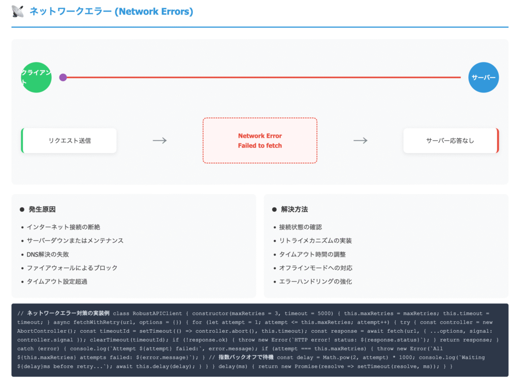- エラーハンドリングを徹底: ネットワークエラー、APIエラー、データパースエラーなど