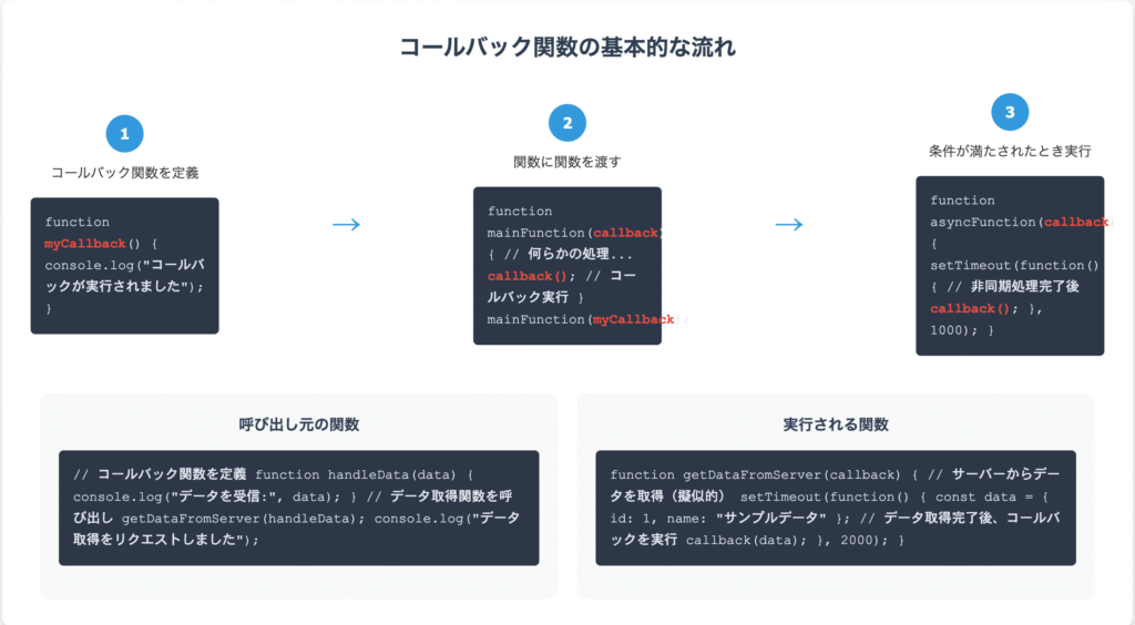 コールバック関数はJavaScriptの非同期処理において長年使われてきた基本的なパターンであり、Promiseやasync/awaitを理解する上でも重要な基礎知識です。