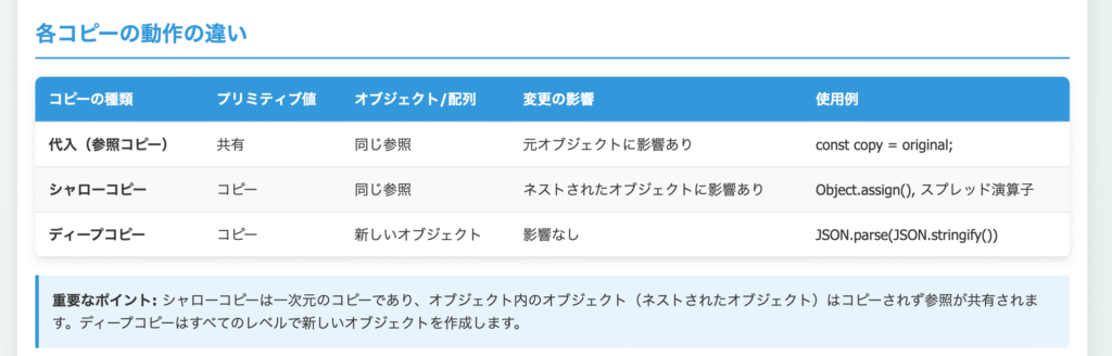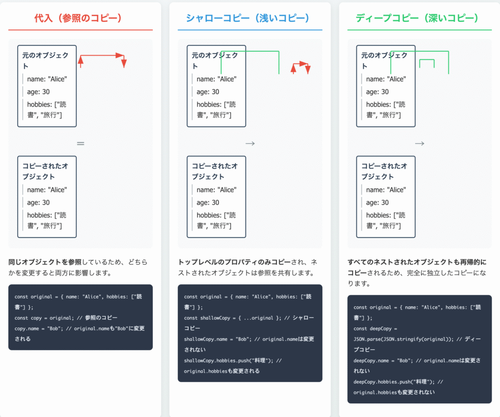 | コピー時の動作 | 値のコピーが作成される | 参照のコピーが作成される |