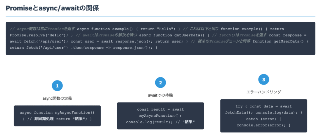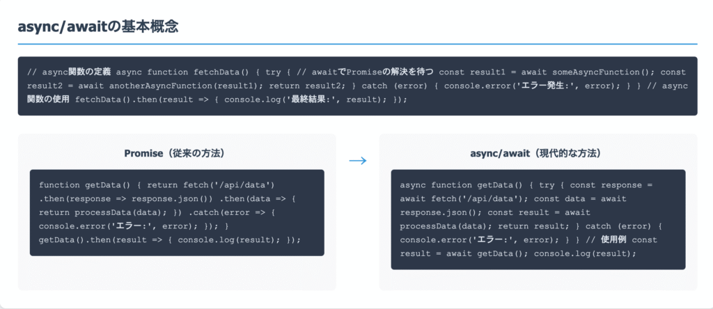 fetchData関数内でfetchを使って/api/dataからデータを取得し、awaitでレスポンスとJSON変換の完了を待っています。エラーが発生した場合はtry...catchで処理し、ログ出力後に再スローします。async関数は自動的にPromiseを返すため、呼び出し側では.then().catch()を使って結果を受け取ることもできます。
