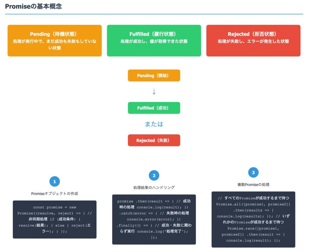 また、Promise.all()やPromise.race()といった便利なメソッドも備えており、コールバック地獄を解消する役割を果たします。さらに、async/awaitの基盤となる仕組みでもあり、現代JavaScriptの非同期処理を支える重要な概念です。