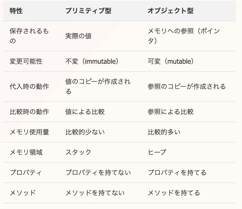 JavaScriptのデータ型はプリミティブ型(基本型)とオブジェクト型に大別されます。