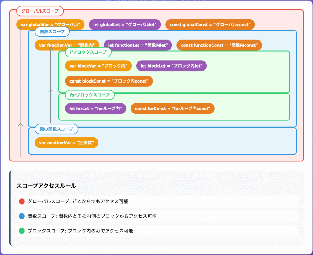 letとconstはブロックスコープ({}で囲まれた範囲)を持ちます。波かっこ {} の内部で宣言された変数や定数は、そのブロックの中でのみ有効です。localVarとLOCAL_CONSTはブロック内では正常に参照できますが、ブロック外からアクセスしようとするとスコープ外エラーが発生します。これにより、変数の誤使用や衝突を防ぐことができます。